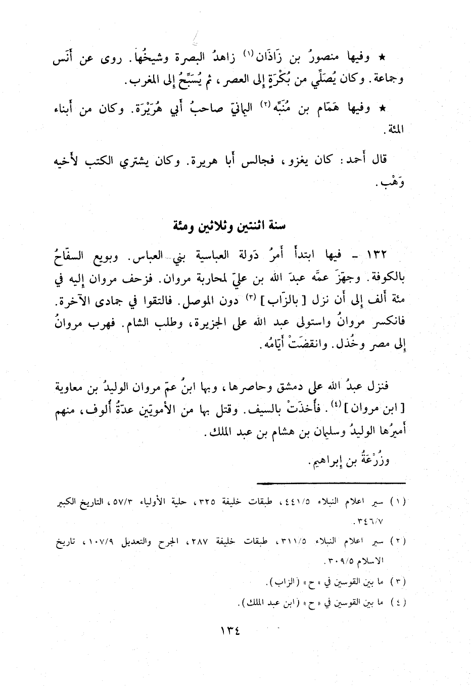وفيها منصور بن زاذان زاهد البصرة وشيخُها. روى عن أنس وجماعة. وكان يصلي من بكرةِ إلى العصر، ثم يُسبحُ إلى المغرب.