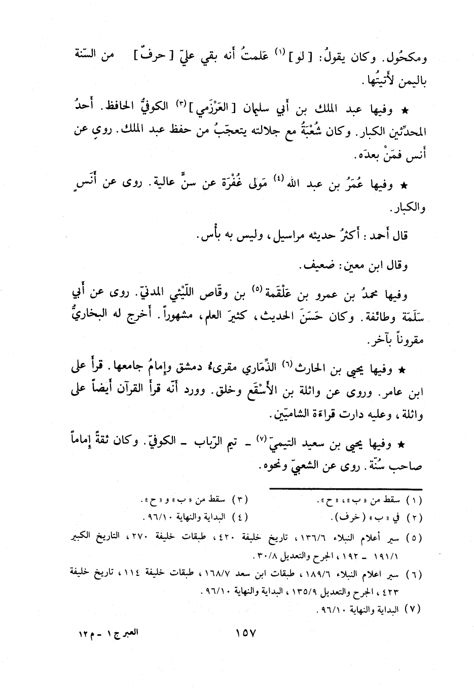 وفيها يحيى بن الحارث الذماري مقرىء دمشق وإمام جامعها. قرأ على ابن عامر. وروى عن واثلة بن الأسقع وخلق. وورد أنه قرأ القرآن أيضاً على واثلة، وعليه دارت قراءة الشاميين. وفيها يحيى بن سعيد التيمي تيم الرباب الكوفي. وكان ثقة إماماً صاحب سنة. روى عن الشعبي ونحوه.