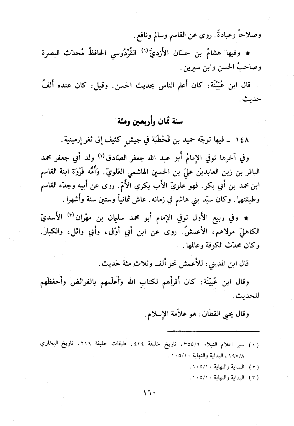 وفي آخرها توفي الإمام أبو عبد الله جعفر الصادق ولد أبي جعفر محمد الباقر بن زين العابدين علي بن الحسين الهاشمي العلوي. وأمه فروة ابنه القاسم ابن محمد بن أبي بكر. فهو علوي الأب بكري الأم. روى عن أبيه وجده القاسم وطبقتهما. وكان سيد بني هاشم في زمانه. عاش ثمانياً وستين سنة وأشهراً.