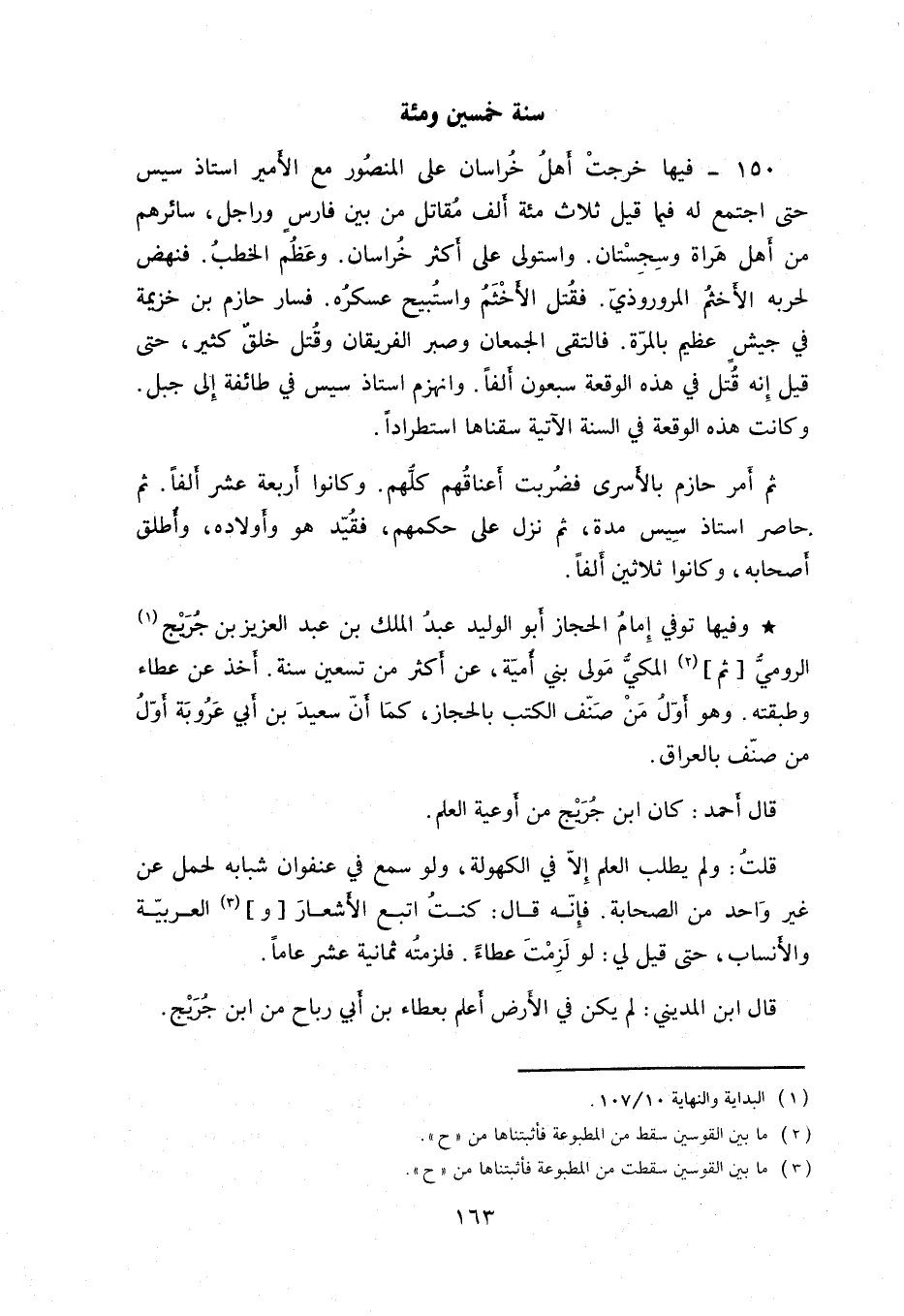 فيها توفي إمام الحجاز أبو الوليد عبد الملك بن عبد العزيز بن جريج الرومي ثم المكي مولى بني أمية، عن أكثر من تسعين سنة. أخذ عن عطاء وطبقته. وهو أول من صنف الكتب بالحجاز، كما أن سعيد بن أبي عروبة أول من صنف بالعراق.