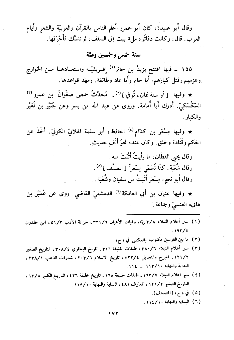 وفيها مسعر بن كدام الحافظ، أبو سلمة الهلالي الكوفي. أخذ عن الحكم وقتادة وخلق. وكان عنده نحو ألف حديث.