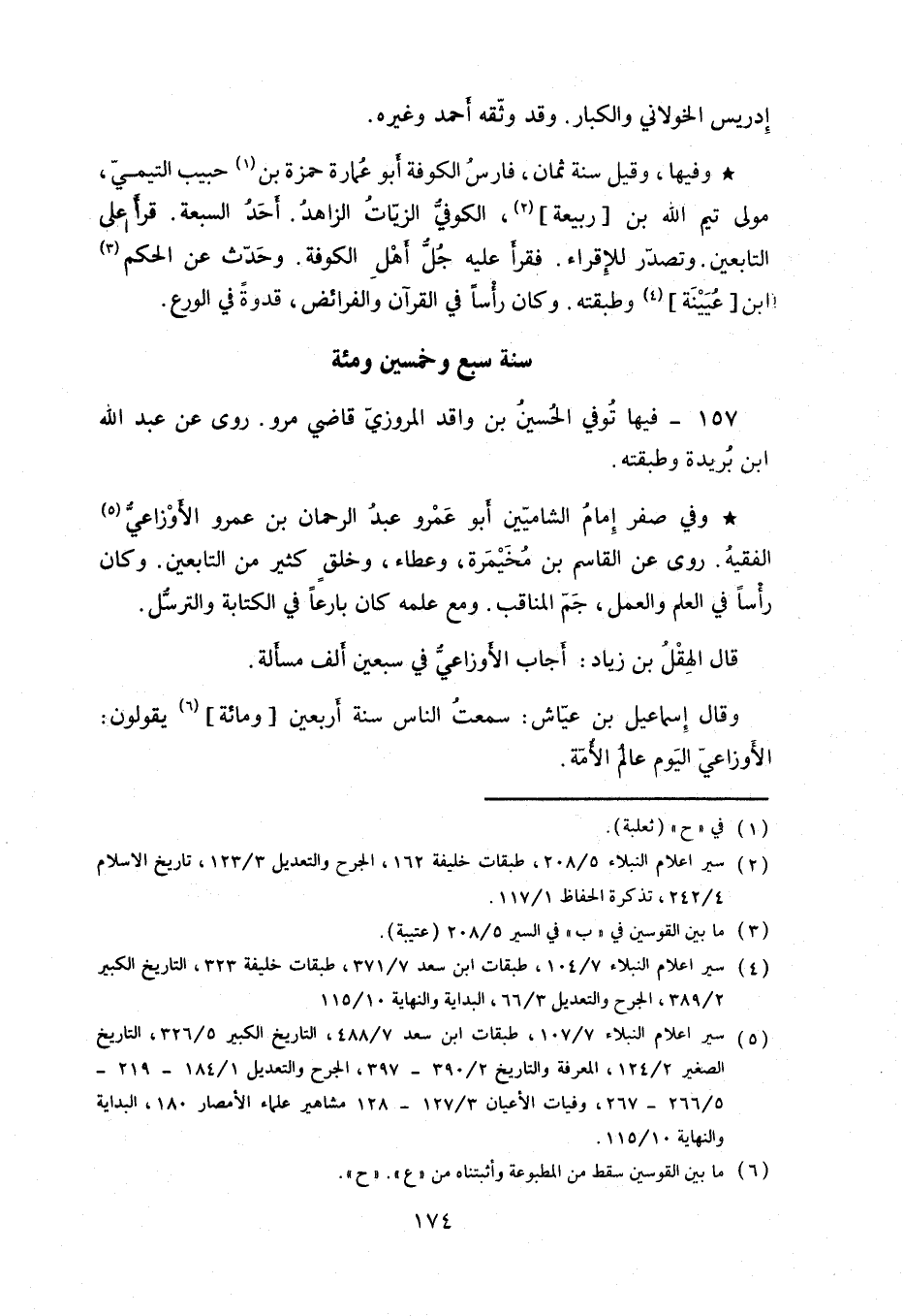 وفي صفر إمام الشاميين أبو عَمْرو عبدُ الرحمن بن عمرو الأْوزاعيُ الفقيهُ. روى عن القاسم مُخَيْمَرة، وعطاء، وخلق كثيرمن التابعين. وكان رأساً في العلم والعمل، جم المناقب. ومع علمه كان بارعاً في الكتابة والترسل.