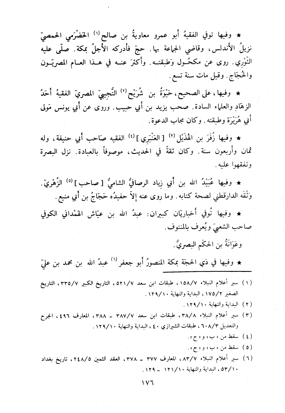 وفيها زُفَرَ بن الهذيل العنبري الفقيه صاحب أبي حنيفة، وله ثمان وأربعون سنة. وكان ثقة في الحديث، موصوفاً بالعبادة. نزل البصرة وتفقهواعليه.