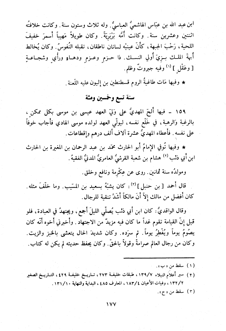 وفيها تُوفي الإمام أبو الحارث محمد بن عبد الرحمن بن المغيرة بن الحارث ابن أبي ذئب هشام بن شعبة القرشي العامري المدني الفقيه.