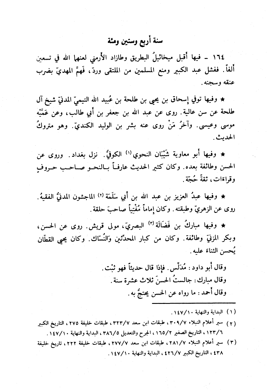 وفيها مبارك بن فضالة البصري، مولى قريش. روى عن الحسن، وبكر المزني وطائفة. وكان من كبار المحدثين والنساك. وكان يحيى القطان يحسن الثناء عليه.