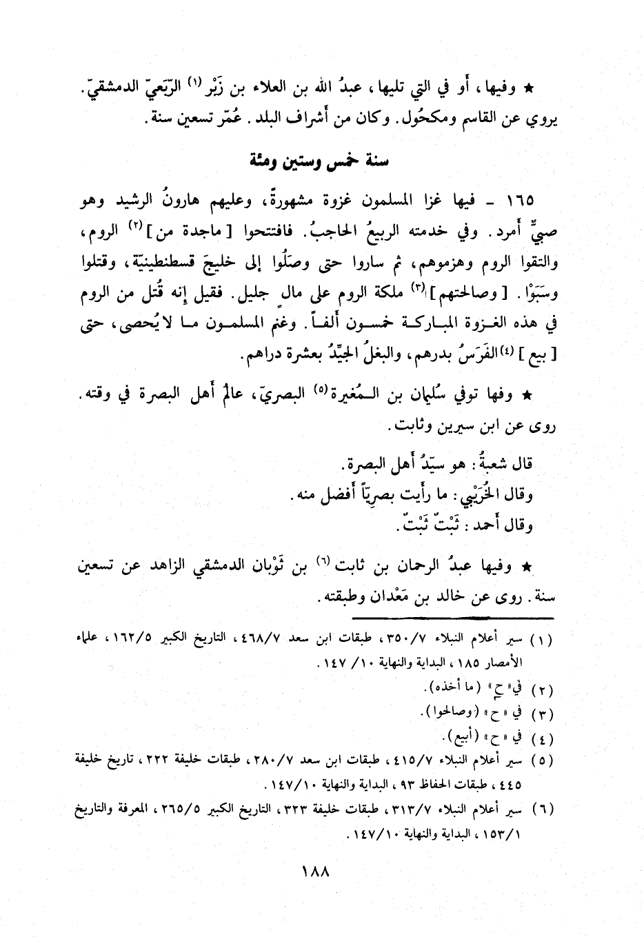 وفيها، أو في التي تليها، عبد الله بن العلاء بن زبر الربعي الدمشقي. يروي بن القاسم ومكحول وكان بن أشراف البلد. عمر تسعين سنة.