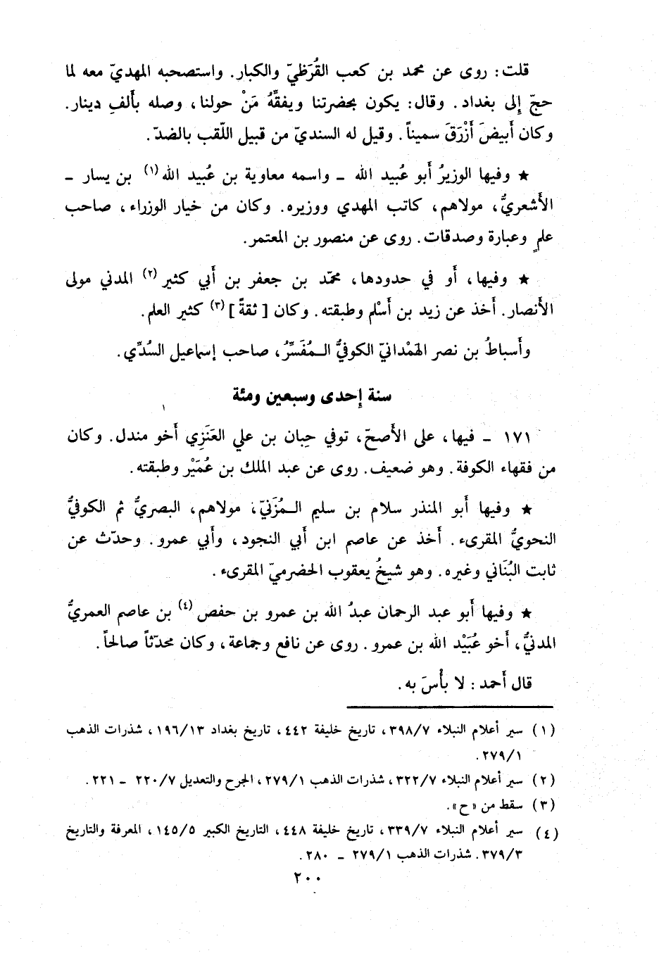 وفيها أبو المنذر سلام بن سلم المزني، مولاهم، البصري ثم الكوفي النحوي المقرىء. أخذ عن عاصم ابن أبي النجود، وأبي عمرو. وحدث عن ثابت البناني وغيره. وهو شيخ يعقوب الحضرمي المقرىء.