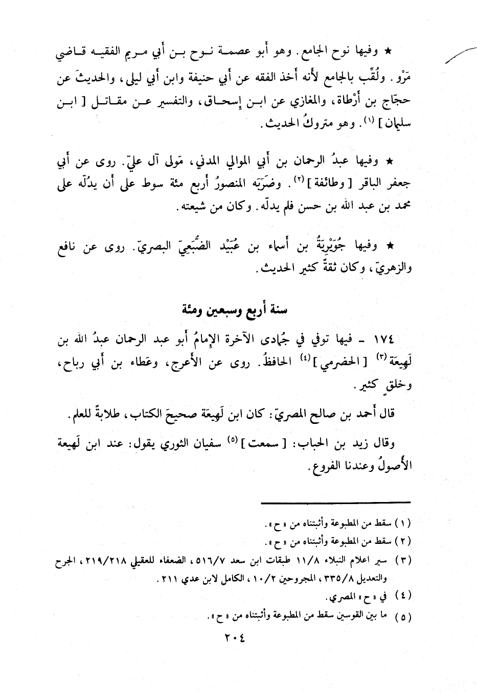 فيها توفي في جمادى الآخرة الإمام أبو عبد الرحمن عبد الله بن لهيعة الحضرمي الحافظ. روى عن الأعرج، وعطاء بن أبي رباح، وخلق كثير.