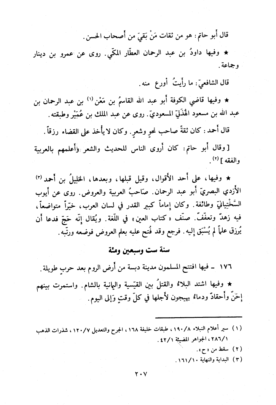 وفيها، على أحد الأقول، وقيل قبلها، وبعدها، الخليل بن أحمد الأزردي البصري أبو عبد الرحمن. صاحب العربية والعروض. روى عن أيوب السيختياني وطائفة. وكان إماماً كبير القدر في لسان العرب، خيراً متواضعاً، فيه زهد وتعفف. صنف كتاب العين في اللغة. ويقال إنه حج فدعا أن يرزق علماً لم يسبق إليه. فرجع وقد فتح عليه بعلم العروض فوضعه ورتبه