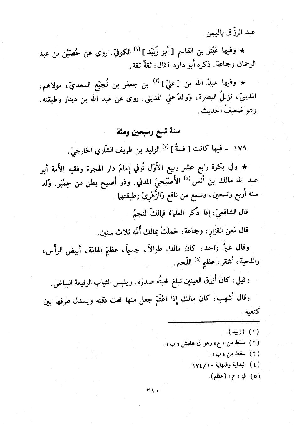 وفي بكرة رابع عشر ربيع الأول توفي في إمام دار الهجرة وفقيه الأمة أبو عبد الله مالك بن أنس الأصبحي المدني. وذو أصبح بطن من حمير. ولد سنة أربع وتسعين، وسمع من نافع والزهري وطبقتهما.