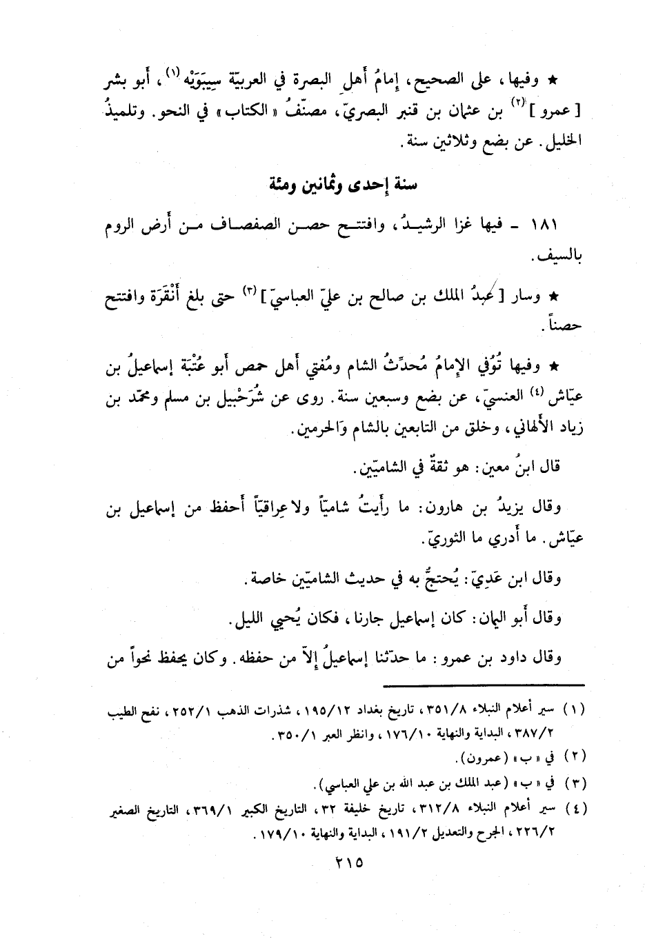 وفيها توفي الامام محدث الشام ومفتي أهل حمص أبو عتبة إسماعيلُ بن عياش العنسي، عن بضع وسبعين سنة. روى عن شرحبيل بن مسلم ومحمد بن زياد الألهاني. وخلق من التابعين بالشام والحرمين.