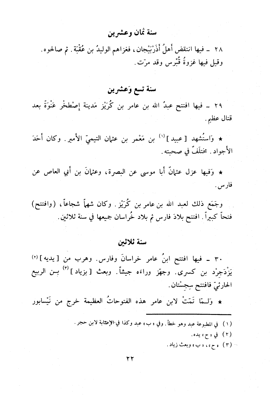 فيها افتتح ابن عامر خراسان وفارس. وهرب من يديه يزدجرد بن كسرى. وجهز وراءه جيشاً. وبعث بزياد بن الربيع الحارثي فافتتح سجستان.