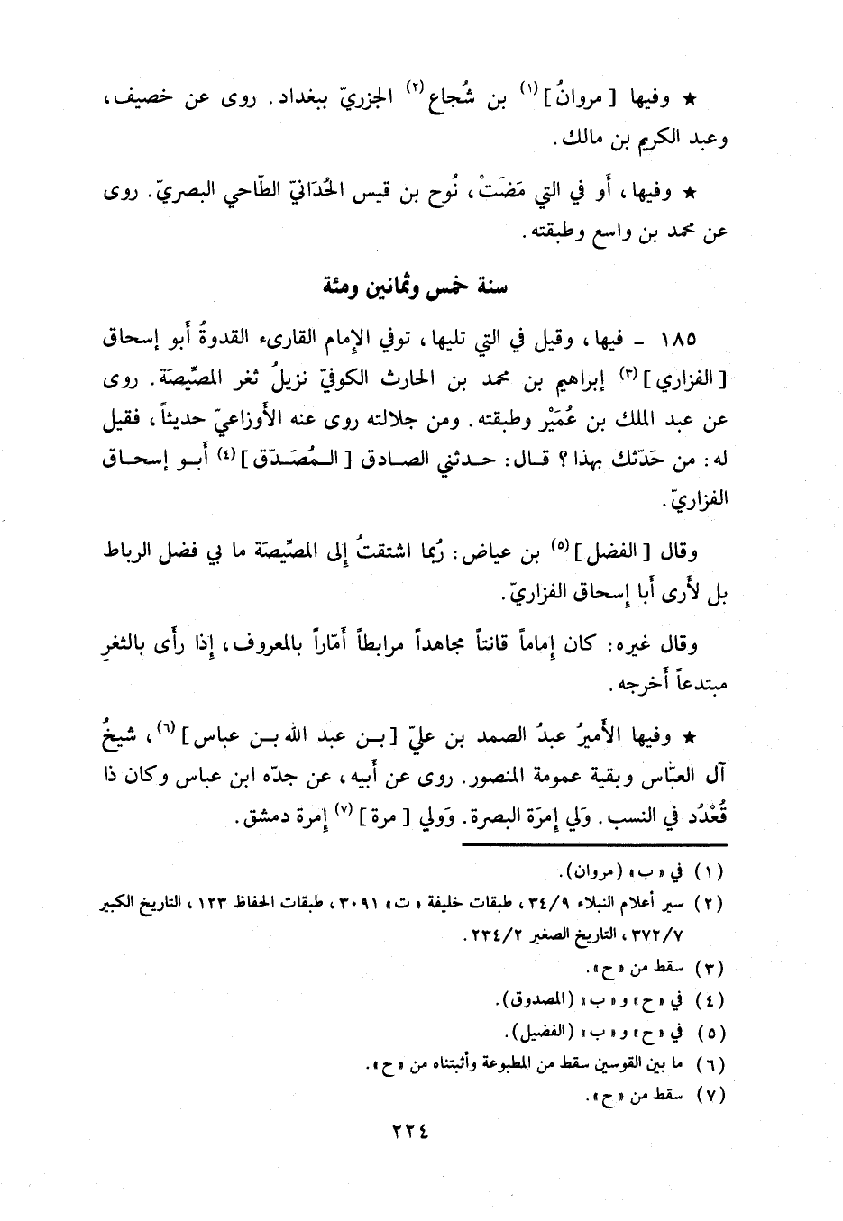 فيها، وقيل في التي تليها، توفي الإمام القارىء القدوة أبو إسحاق الفزاري إبراهيم بن محمد بن الحارث الكوفي نزيل ثغر المصيصَة. روى عن عبد الملك بن عمير وطبقته. ومن جلالته روى عنه الأوزاعي حديثاً، فقيل له: من حدثك بهذا؟ قال: حدثني الصادق المصدق أبو إسحاق الفزاريَ.