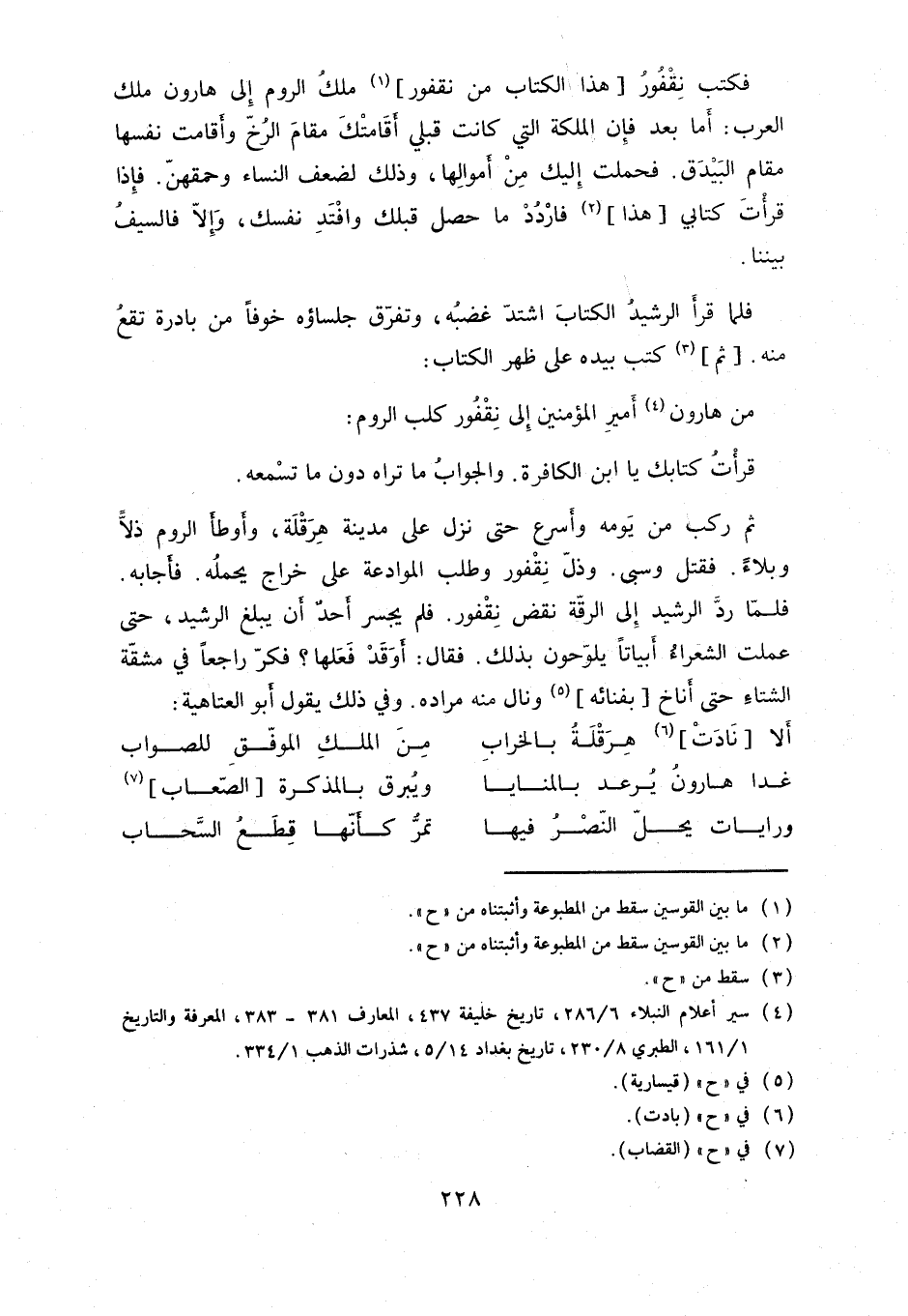 فكتب نقفور هذا الكتاب من نقفور ملك الروم إلى هارون ملك العرب أما بعد فإن الملكة التي كانت قبلي أقامتك مقام الرخ وأقامت نفسها مقام البيدق. فحملت إليك من أموالها، وذلك لضعف النساء وحمقهن. فإذا قرأت كتابي هذا فاردد ما حصل قبلك وافتد نفسك، وإلا فالسيفُ بيننا.