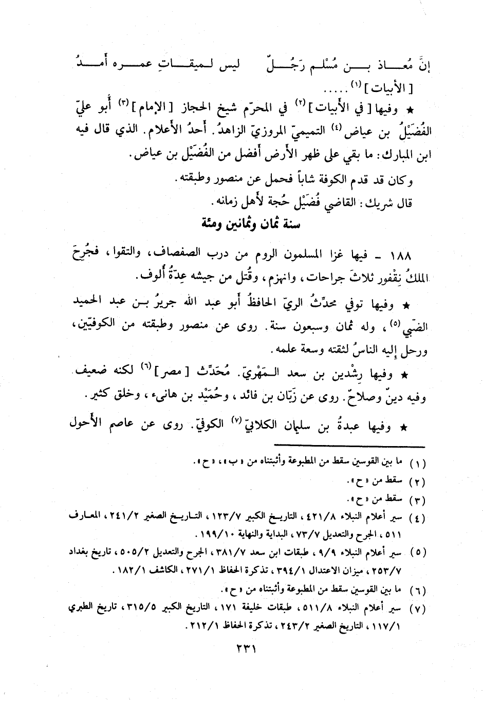 وفيها توفي محدث الري الحافظ أبو عبد الله جرير بن عبد الحميد الضبي. وله ثمان وسبعون سنة. روى عن منصور وطبقته من الكوفيين، ورحل إليه الناس لثقته وسعة علمه.