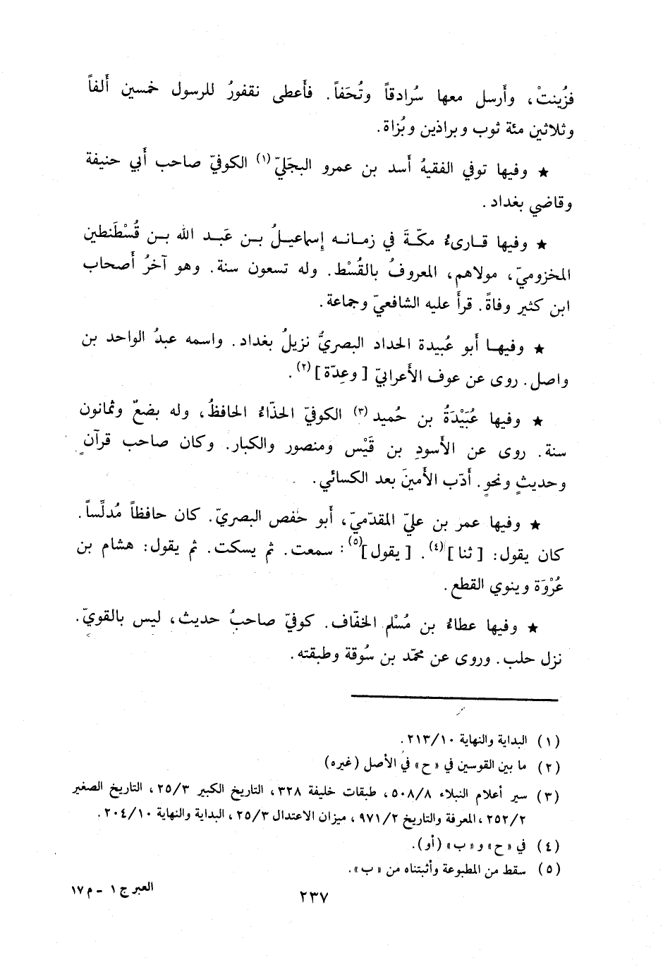 وفيها عطاء بن مسلم الخفاف. كوفي صاحب حديث، ليس بالقوي. نزل حلب. وروى عن محمد بن سوقة وطبقته.