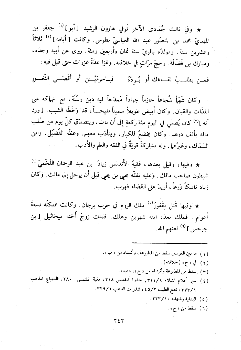 وفيها وقيل بعدها. فقيه الأندلس زياد بن عبد الرحمن اللخمي شبطون صاحب مالك. وعليه تفقه يحيى بن يحيى قبل أن يرحل الى مالك. وكان زياد ناسكاً ورعاً، أريد على القضاء فهرب. وفيها نقفور ملك الروم في حرب برجان. وكانت مملكته تسعة أعوام. فملك بعده ابنه شهرين وهلك. فملك زوج أخته ميخائل بن جرجس لعنهم الله.