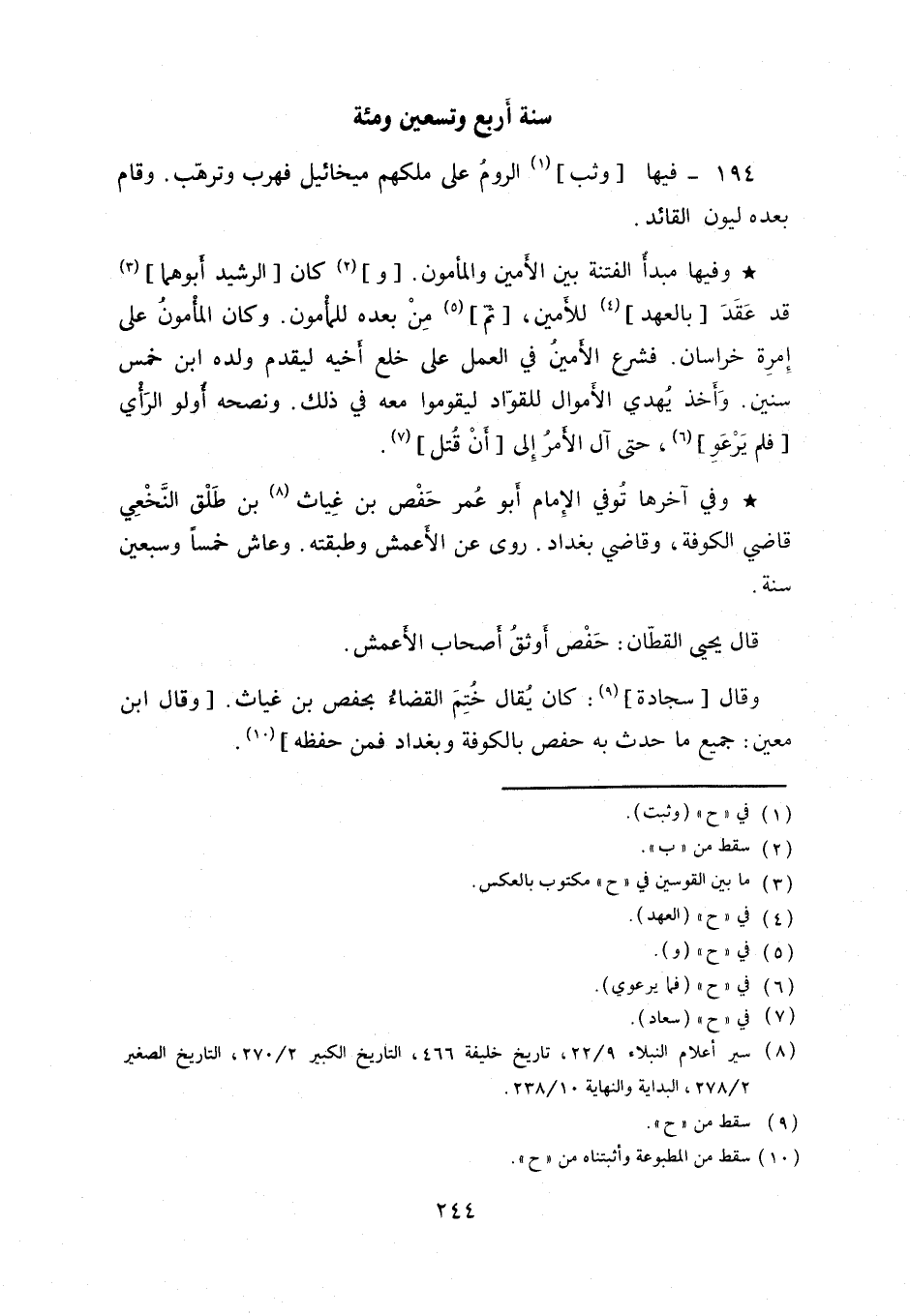 وفي آخرها توفي الإمام أبو عمر حفص بن غياث بن طلق النخعي قاضي الكوفة، وقاضي بغداد. روى عن الأعمش وطبقته. وعاش خمساً وسبعين سنة.