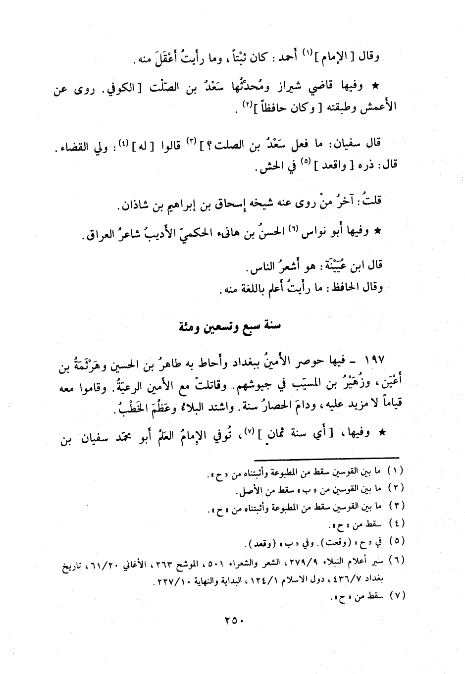 فيها حوصر الأمين ببغداد وأحاط به طاهر بن الحسين وهرثمة بن أعين، وزهير بن المسيب في جيوشهم. وقاتلت مع الأمين الرعية. وقاموا معه قياماً لا مزيد عليه، ودام الحصار سنة. واشتد البلاء وعظم الخطب.