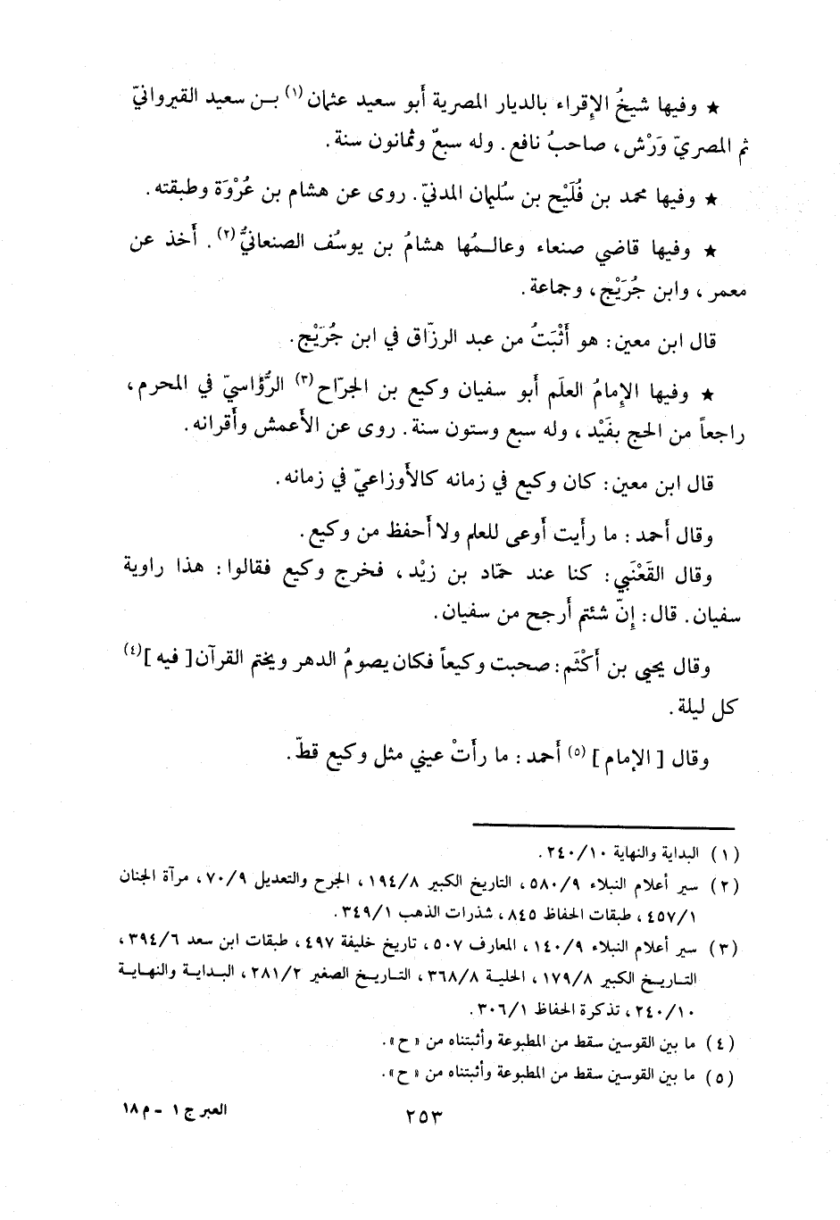 وفيها الإمام العلم أبو سفيان وكيع بن الجراح الرؤاسي في المحرم، راجعاً من الحج بفَيد، وله سبع وستون سنة. روى عن الأعمش وأقرانه.