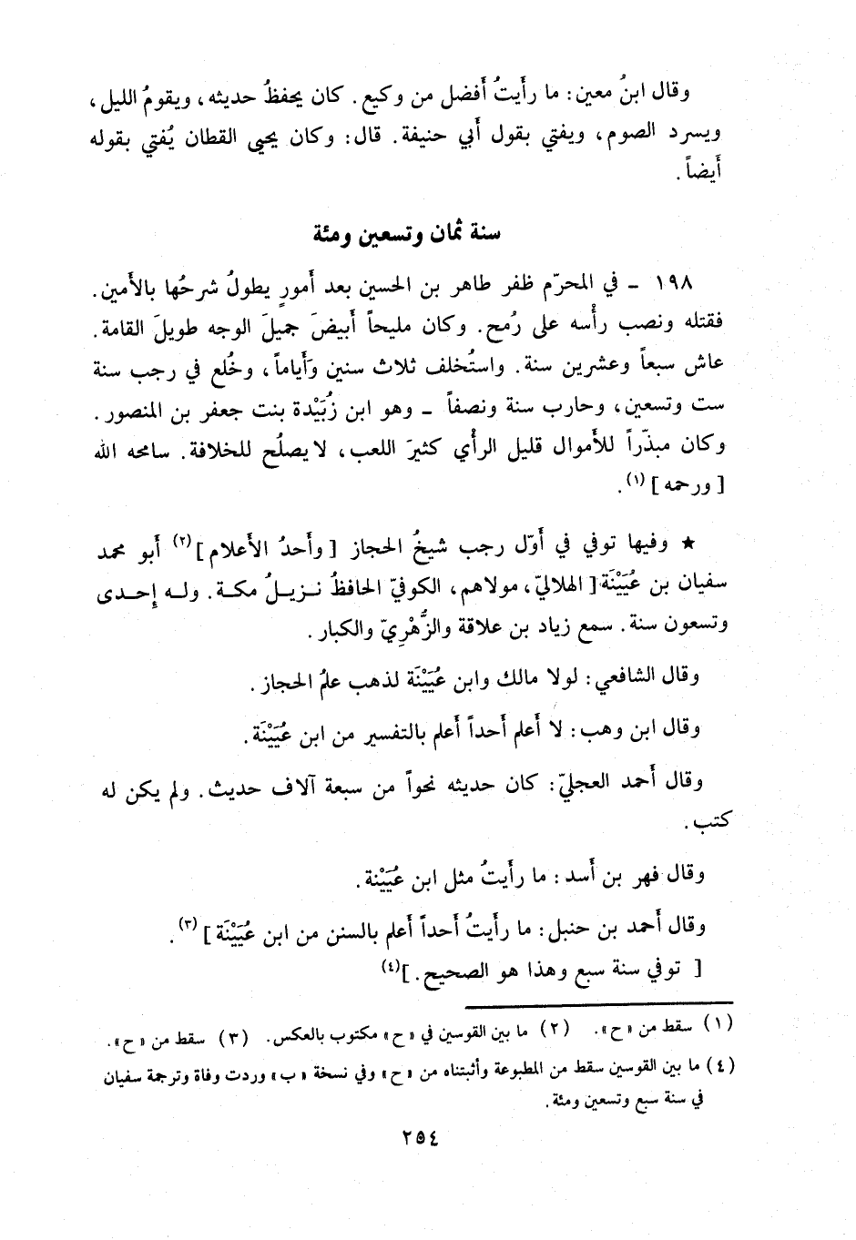 وفيها توفي أول رجب شيخ الحجاز وأحد الأعلام أبو محمد سفيان بن عيينة الهلالي، مولاهم، الكوفي الحافظ نزيل مكة. وله إحدى وتسعون سنة. سمع زياد بن علاقة والزهري والكبار.