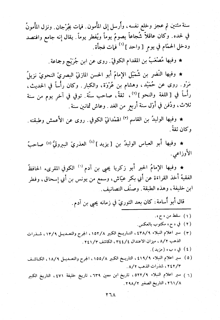 وفيها الإمام الحبر أبو زكريا يحيى بن آدم الكوفي المقرىء الحافظ الفقيه أخذ القراءة عن أبي بكر عياش، وسمع بن يونس بن أبي إسحاق. وفطر ابن خليفة. وهذه الطبقة. وصنف التصانيف.