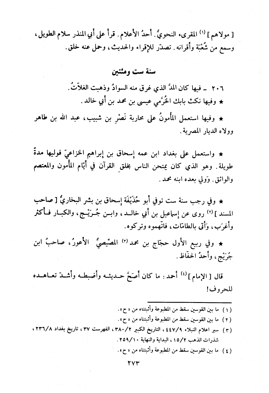وفي رجب سنة ست توفي أبو حذيفة إسحاق بن بشر البخاري صاحب المسند روى عن إسماعيل بن أبي خالد، وابن جريج، والكبار فأكثر وأغرب، وأتى بالطامات، فاتهموه وتركوه. وفي ربيع الأول حجاح بن محمد المصيصي الأعور، صاحب ابن جريج، وأحد الحفاظ.