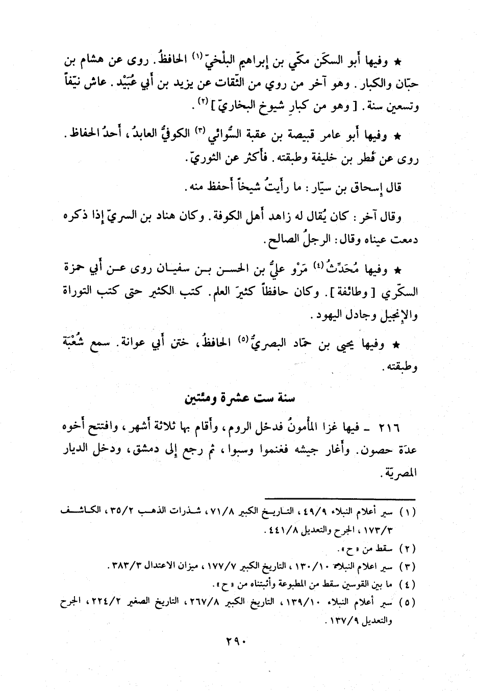 وفيها أبو السكن مكي بن إبراهيم البلخي الحافظ. روى عن هشام بن حبان والكبار وهو آخر من روي من الثقات عن يزيد بن أبي عبيد. عاش نيفاً وتسعين سنة. وهو من كبار شيوخ البخاري.