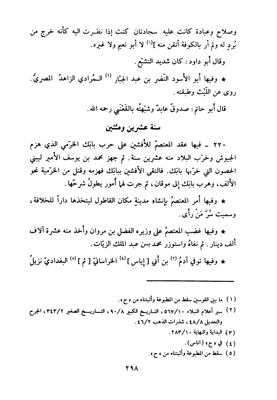 فيها عقد المعتصم للأفشين على حرب بابك الخرمي الذي هزم الجيوش وخرب البلاد منه عشرين سنة. ثم جهز محمد بن يوسف الأمير ليبني الحصون التي خربها بابك. فالتقى الأفشين ببابك فهزمه وقتل من الخرمية نحو الألف، وهرب بابك إلى موقان، ثم جرت لهما أمور يطول شرحها.