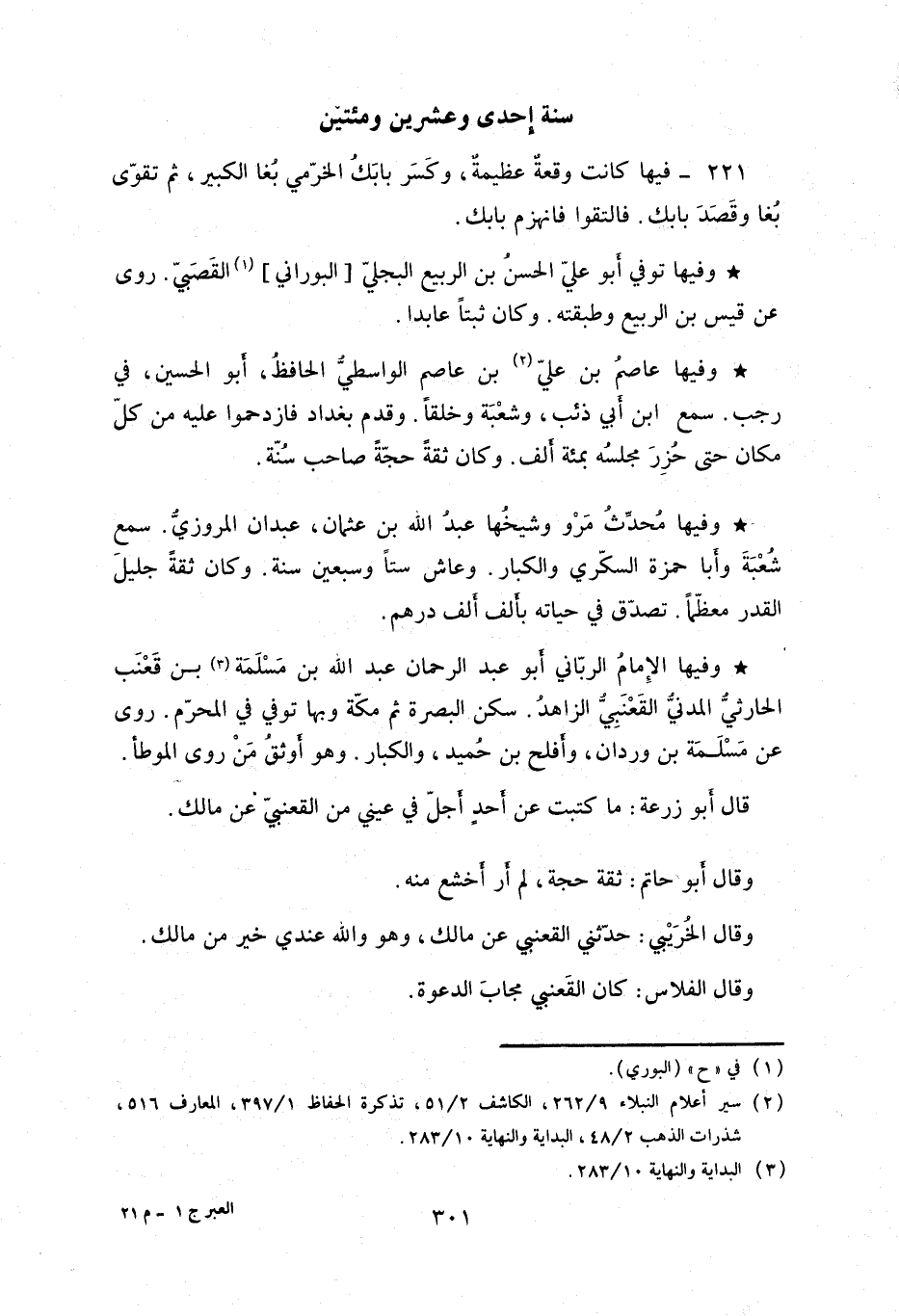 وفيها الإمام الرباني أبو عبد الرحمن عبد الله بن مسلمة بن قعنب الحارثي المدني القعنبي الزاهد. سكن البصرة ثم مكة وبها توفي في المحرم روى عن مسلمة بن وردان، وأفلح بن حميد، والكبار. وهو أوثق من روى الموطأ.