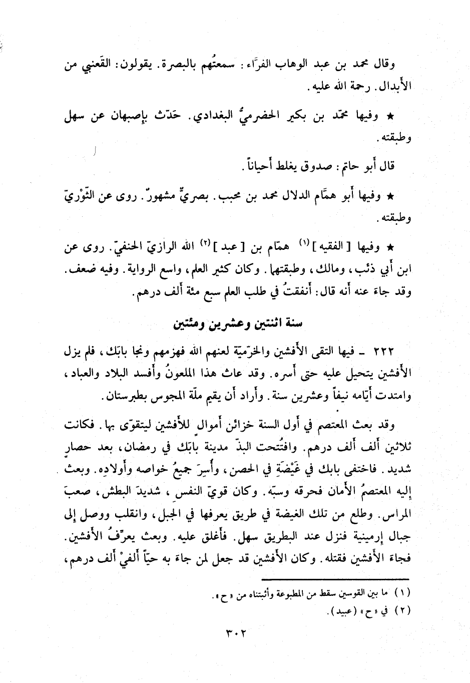 فيها التقى الأفشين والخرمية لعنهم الله فهزمهم ونجا بابك، فلم يزل الأفشين يتحيل عليه حتى أسره ومات وقد عاث هذا الملعون وأفسد البلاد والعباد. وامتدت أيامه نيفاً وعشرين سنة. وأراد أن يقيم ملة المجوس بطبرستان.
