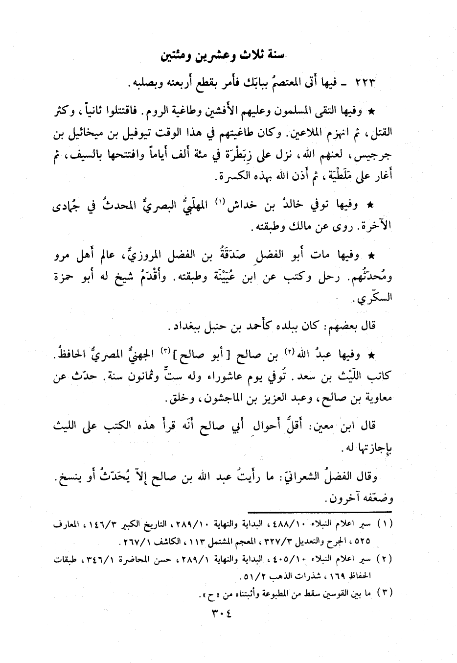 وفيها التقى المسلمون وعليهم الأفشين وطاغية الروم. فاقتتلوا ثانياً، وكثر القتل، ثم انهزم الملاعين. وكان طاغيتهم في هذا الوقت تيوفيل بن ميخائيل بن جرجيس، لعنهم الله، نزل على زبطرة في مئة ألف أياماً وافتتحها بالسيف، ثم أغار على ملطية، ثم أذن الله بهذه الكسرة. وفيها توفي خالد بن خداش المهلبي البصري المحدث في جمادى الآخرة. روى عم عن مالك وطبقته.