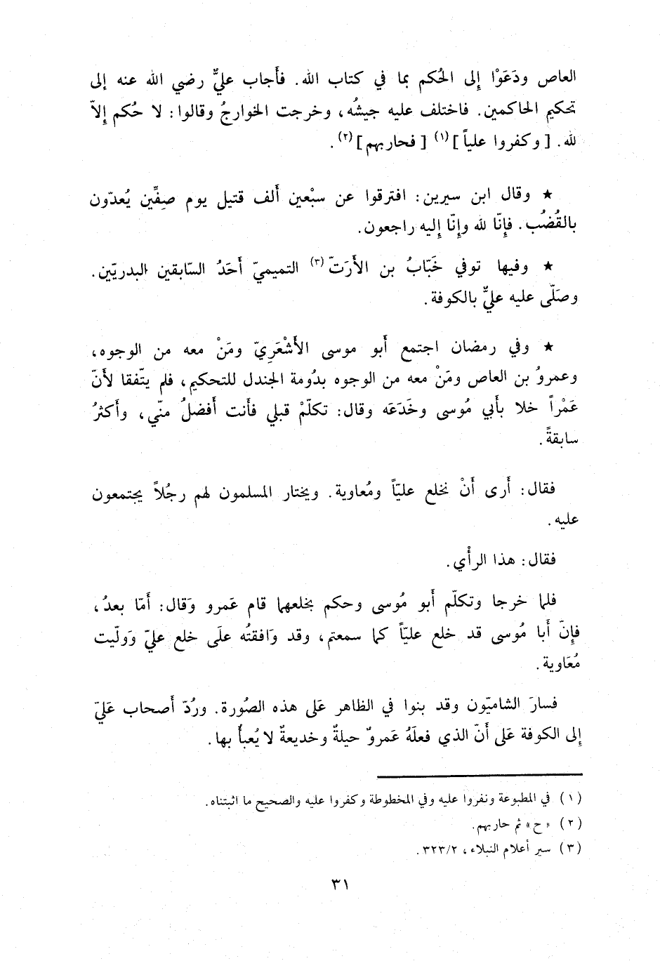 العاص ودعوا إلى الحكم بما في كتاب الله. فأجاب علي رضي الله عنه إلى تحكيم الحاكمين. فاختلف عليه جيشه، وخرجت الخوارج وقالوا: لا حكم إلا لله. وكفروا علياً فحاربهم.