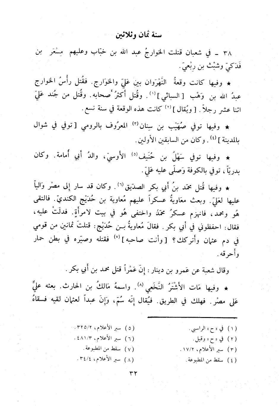 في شعبان قتلت الخوارج عبد الله بن خباب وعليهم مسعر بن فدكي وشبث بن ربعي.