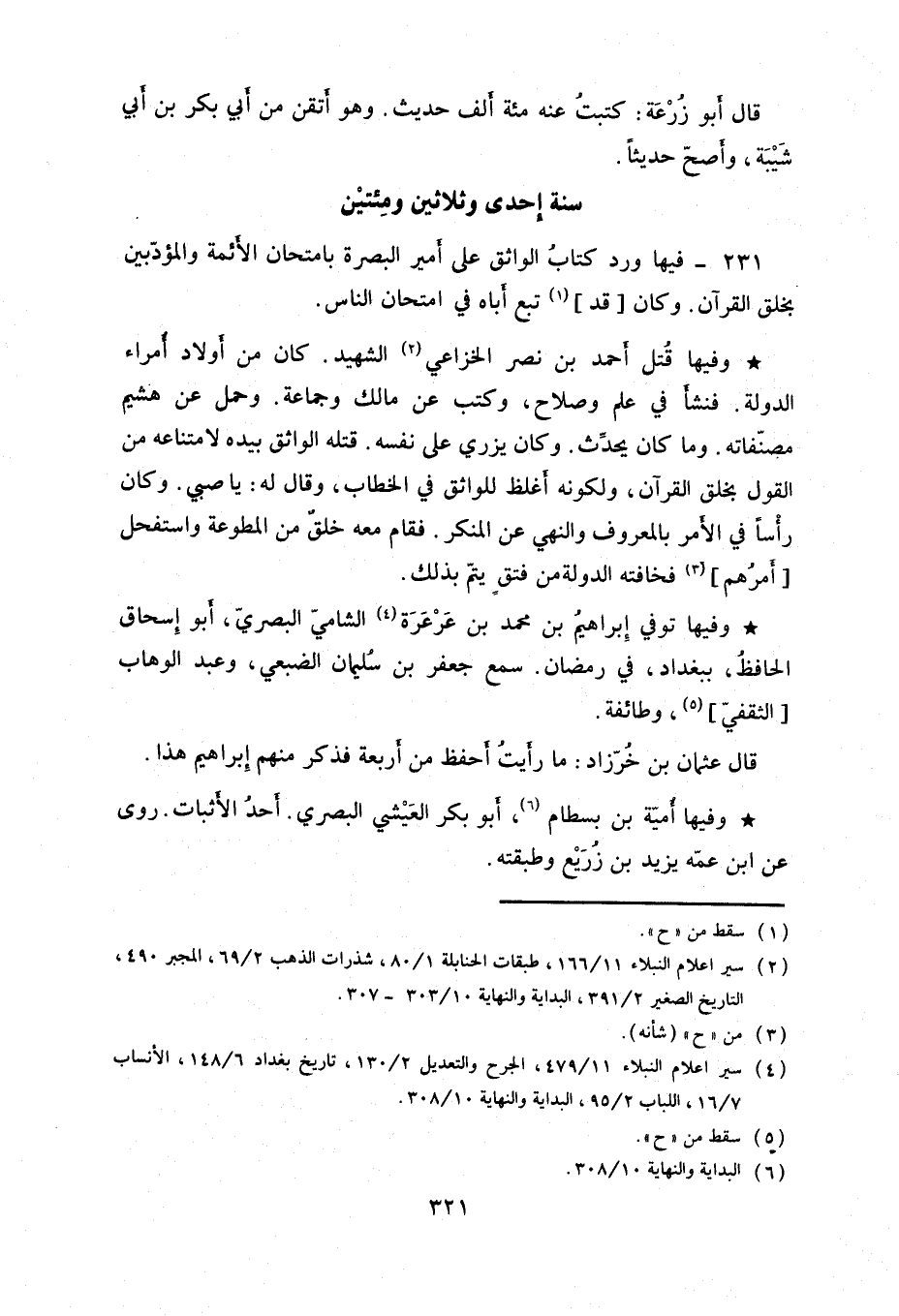 وفيها قتل أحمد بن نصر الخزاعي الشهيد. كان من أولاد أمراء الدولة. فنشأ في علم وصلاح، وكتب عن مالك وجماعة. وحمل عن هشيم مصنفاته. وما كان يحدث. وكان يزري على نفسه. قتله الواثق بيده لامتناعه من القول بخلق القرآن، ولكونه أغلط للواثق في الخطاب، وقال له: يا صبي. وكان رأساً في الأمر بالمعروف والنهي عن المنكر. فقام معه خلق من المطوعة واستفحل أمرهم فخافته الدولة من فتق يتم بذلك.