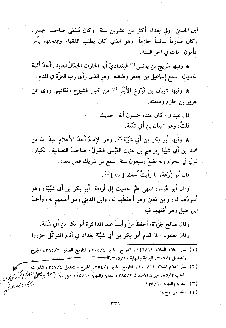 وفيها سريج بن يونس البغدادي أبو الحارث الجمال العابد. أحد أئمة الحديث. سمع إسماعيل بن جعفر وطبقته. وهو الذي رأى رب العزة في المنام.
