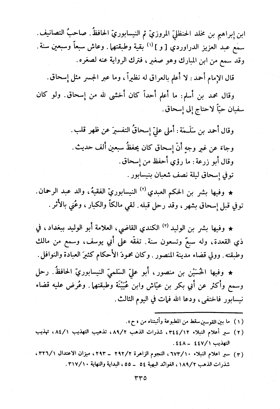وفيها بشر بن الحكم العبدي النيسابوري الفقيه، والد عبد الرحمن. توفي قبل إسحاق بشهر، وقد رحل قبله. لقي مالكاً والكبار، عني بالأثر.