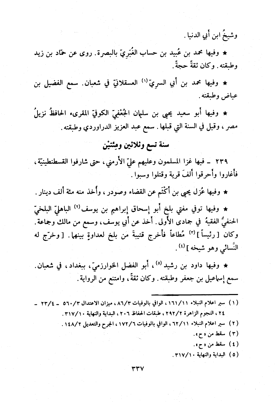 وفيها محمد بن عبيد بن حساب الغبري بالبصرة. روى عن حماد بن زيد وطبقته. وكان ثقة حجة.