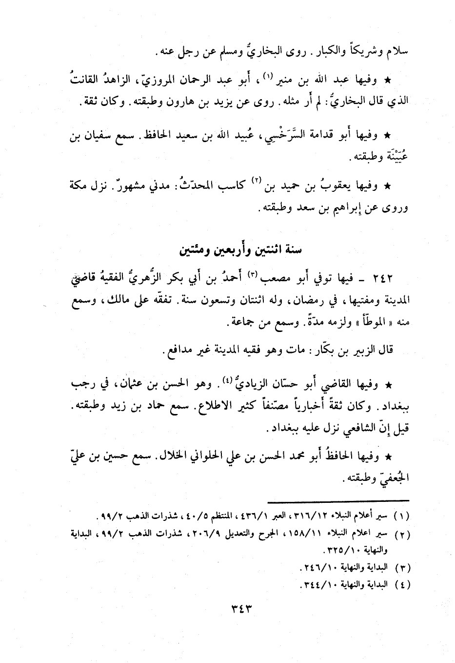وفيها عبد الله بن منير. أبو عبد الرحمن المروزي. الزاهد القانت الذي قال البخاري: لم أر مثله روى عن يزيد بن هارون وطبقته. وكان ثقة.
