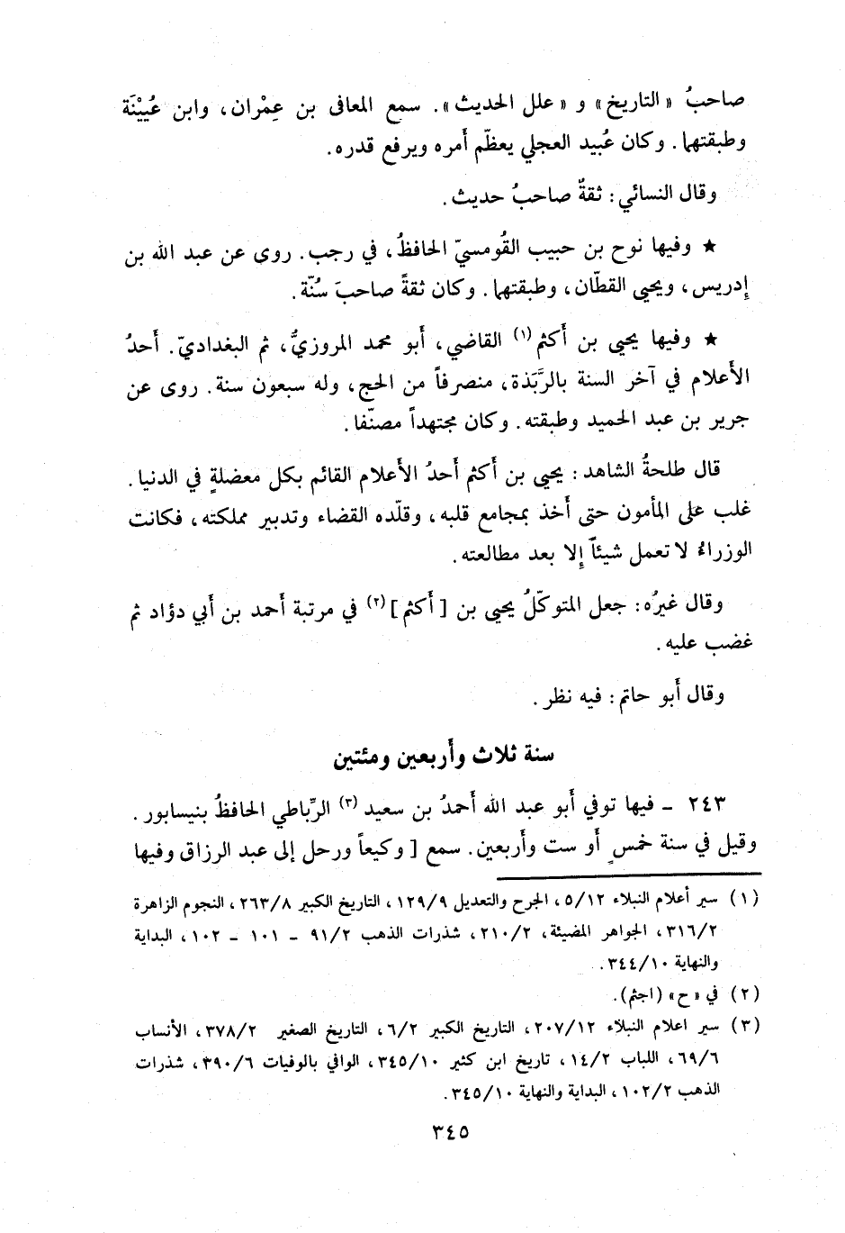 وفيها يحيى بن أكثم القاضي، أبو محمد المروزي، ثم البغدادي. أحد الأعلام في آخر السنة بالربذة. منصرفاً من الحج، وله سبعون سنة. روى عن جرير بن عبد الحميد وطبقته. وكان مجتهداً مصنفاً.