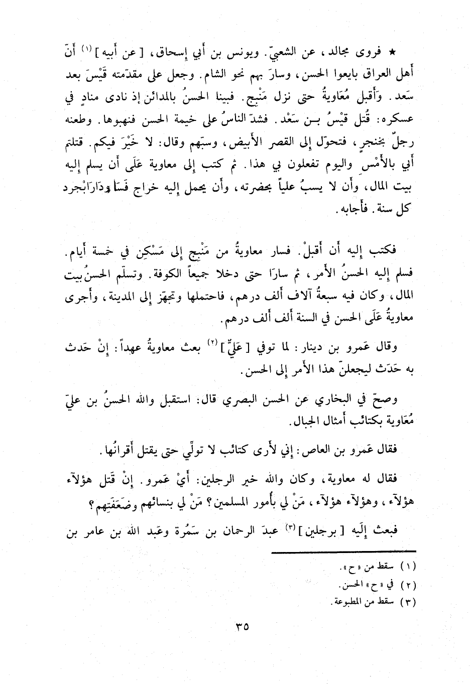 فقال له معاوية، وكان والله خير الرجلين: أي عمرو. إن قتل هؤلاء هؤلاء، وهؤلاء هؤلاء، من لي بأمور المسلمين؟ من لي بنسائهم وضعفتهم؟ فبعث إليه برجلين عبد الرحمن بن سمرة وعبد الله بن عامر بن كريز في الصلح.
