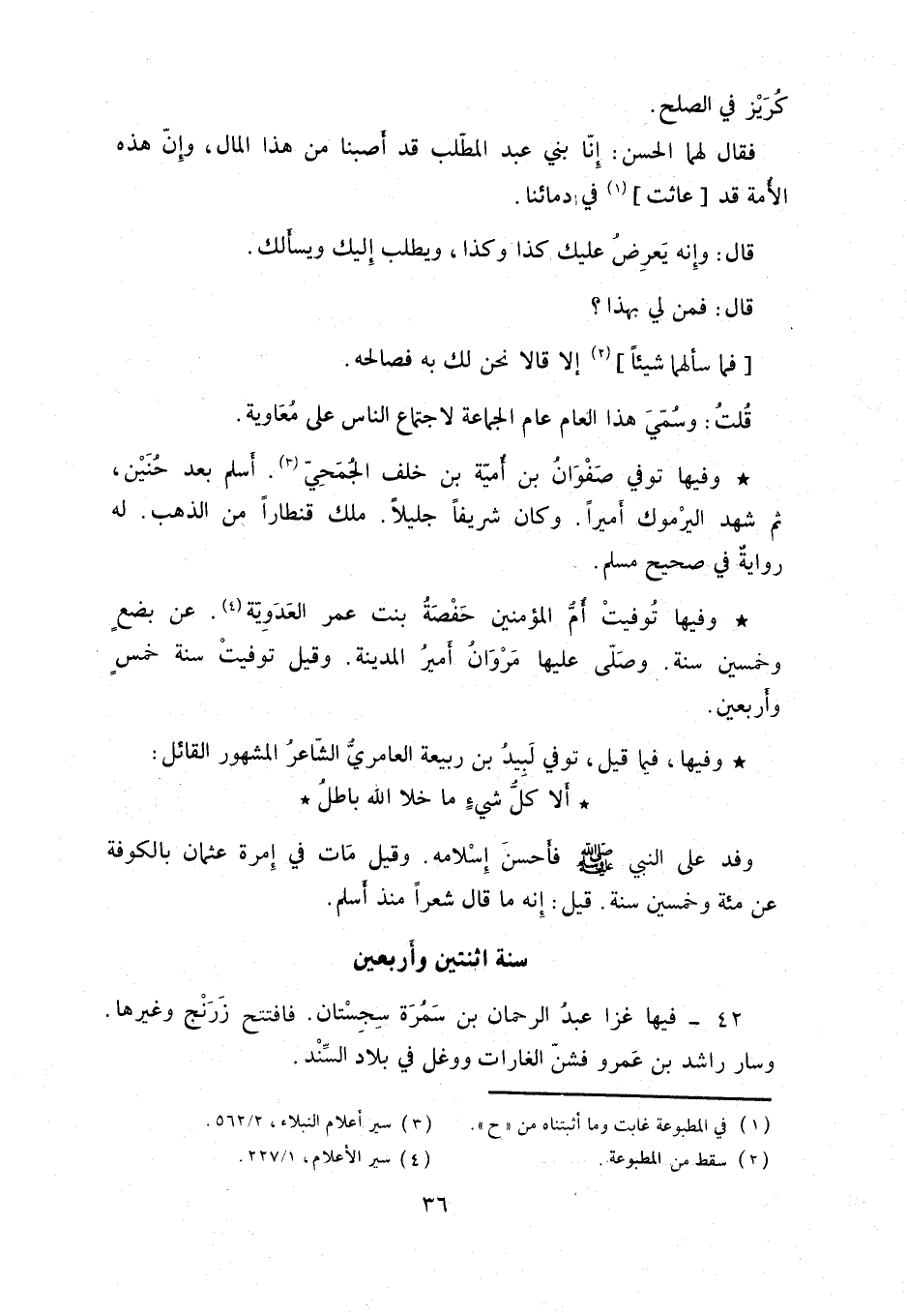 وفيها توفي صفوان بن أمية بن خلف الجمحي. أسلم بعد حنين، ثم شهد اليرموك أميراً. وكان شريفاً جليلاً. وملك قنطاراً من الذهب. وله رواية في صحيح مسلم.