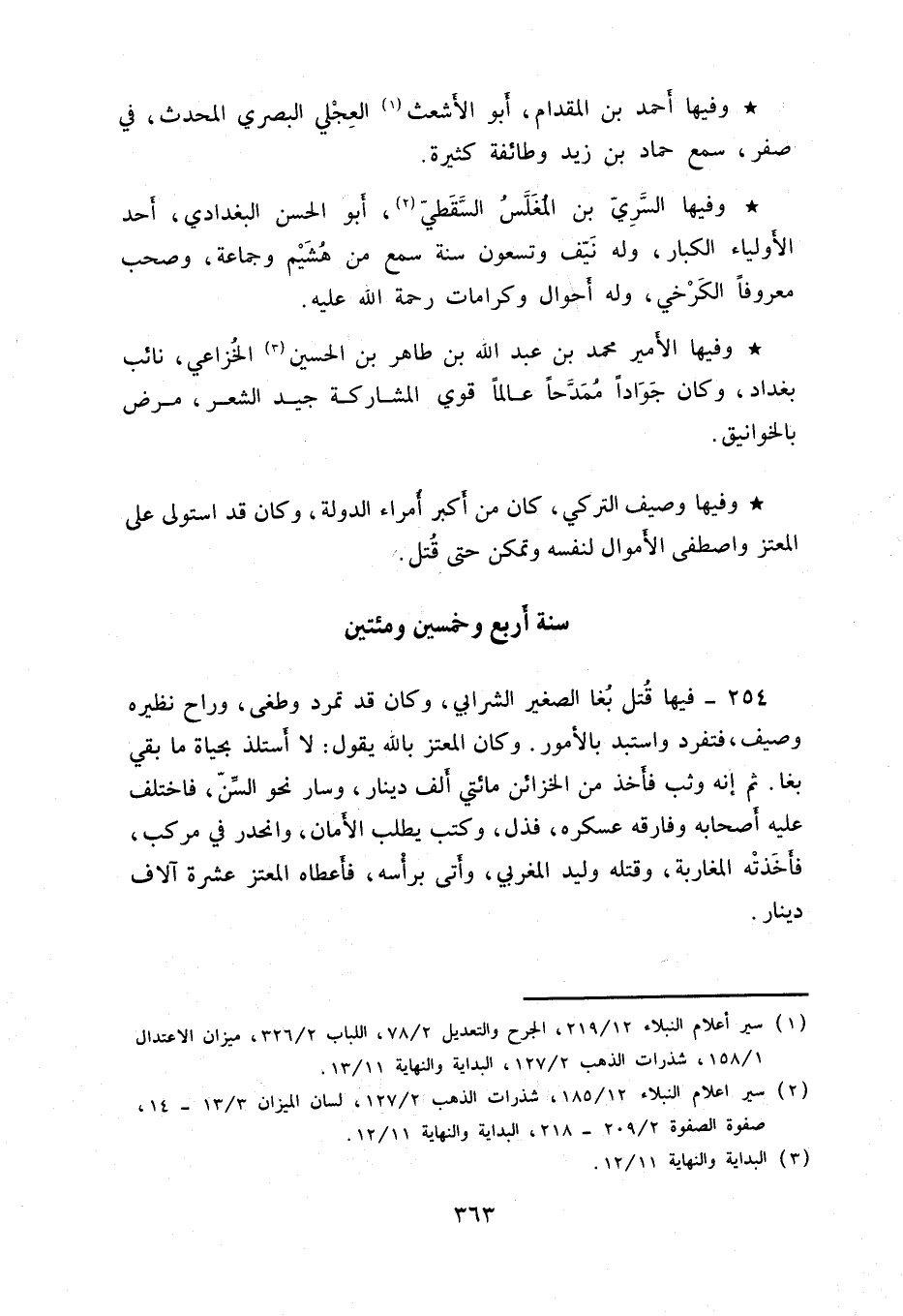 وفيها السري بن المغلس السقطي، أبو الحسن البغدادي، أحد الأولياء الكبار، وله نيف وتسعون سنة سمع من هشيم وجماعة، وصحب معروفاً الكرخي، وله أحوال وكرامات رحمة الله عليه. وفيها الأمير محمد بن عبد الله بن طاهر بن الحسين الخزاعي، نائب بغداد، وكان جواداً ممدحاً عالماً قوي المشاركة جيد الشعر، مرض بالخوانيق.