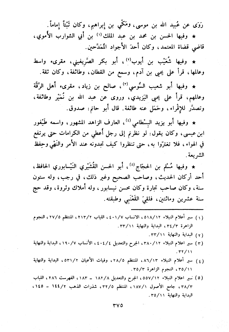 وفيها أبو يزيد البسطامي، العارف الزاهد المشهور، واسمه طيفور ابن عيسى، وكان يقول: لو نظرتم إلى رجل أعطي من الكرامات حتى يرتفع في الهواء، فلا تغتروا به، حتى تنظروا كيف تجدونه عند الأمر والنهي وحفظ الشريعة.