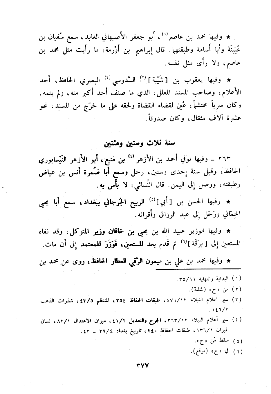 وفيها يعقوب بن شيبة السدوسي البصري الحافظ، أحد الأعلام، وصاحب المسند المعلل، الذي ما صنف أحد أكبر منه، ولم يتمه، وكان سرياً محتشماً، عين لقضاء القضاة ولحقه على ما خرج من المسند، نحوعشرة آلاف مثقال. وكان صدوقاً.