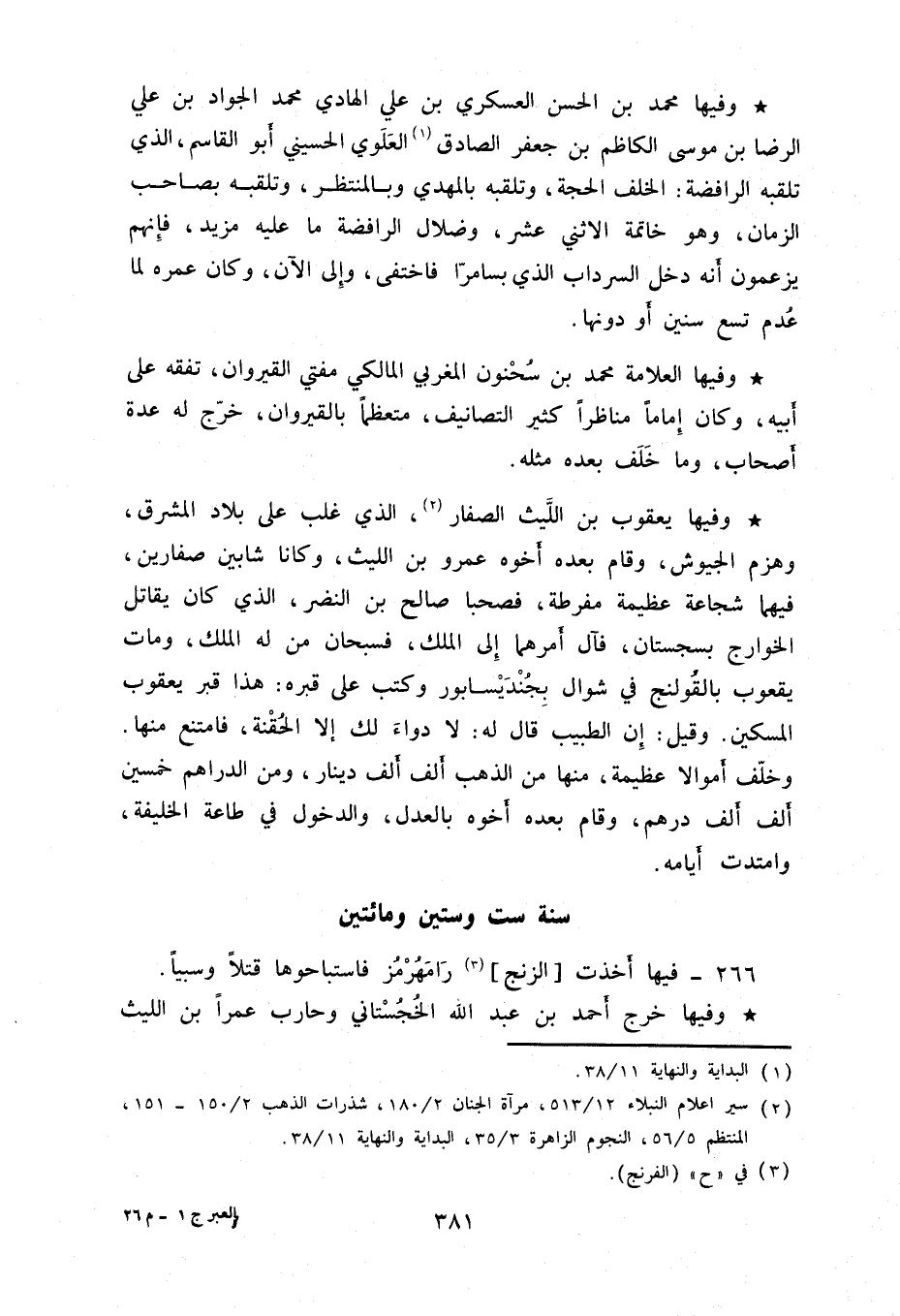 وفيها يعقوب بن الليث الصفار، الذي غلب على بلاد المشرق، وهزم الجيوش، وقام بعده أخوه عمرو بن الليث، وكانا شابين صفارين. فيهما شجاعة عظيمة مفرطة، فصحبا صالح بن النضر، الذي كان يقاتل الخوارح بسجستان، فآل أمرهما إلى الملك، فسبحان من له الملك، ومات يعقوب بالقولنج في شوال بحند نيسابور وكتب على قبره: هذا قبر يعقوب المسكين. وقيل: إن الطبيب قال له: لا دواء لك إلا الحقنة، فامتنع منها.