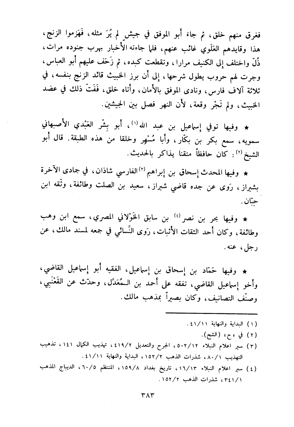 وفيها المحدث إسحاق بن إبراهيم الفارسي شاذان في جمادى الآخرة بشيراز روى عن قاضي شيراز سعيد بن الصلت وطائفة وثقه ابن حبان.