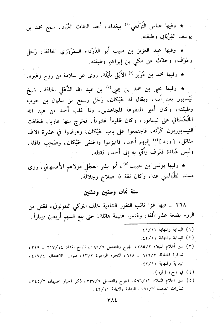 وفيها يحيى بن محمد بن يحيى بن عبد الله الذهلي الحافظ، شيخ النيسابور بعد أبيه، ويقال له حيكان. رحل وسمع بن سليمان بن حرب وطبقته. وكان أمير المتطوعة المجاهدين، ولما غلب أحمد بن عبد الله الخجستاني على نيسابور، وكان ظلوماً غشوماً، فخرج منها هارباً. فخافت النيسابوريون كرته، فاجتمعوا على باب حيكان، وعرضوا في عشرة آلاف مقاتل ورد إليهم أحمد، فانهزموا واختفى حيكان. وصحب قافلة، ولبس عباءة فعرف وأتي به إلى أحمد، فقتله. وفيها يونس بن حبيب أبو بشر العجلي مولاهم الأصبهاني. روى مسند الطيالسي عنه، وكان ثقة ذا صلاح وجلالة.