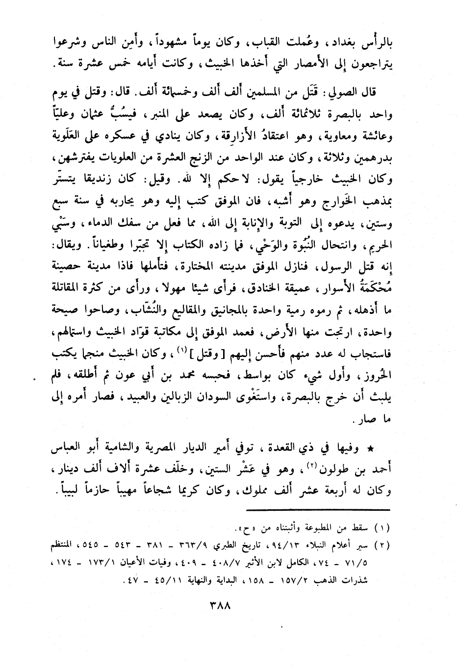 قال الصولي: قتل من المسلمين ألف ألف وخمسمائة ألف. قال: وقتل في يوم واحد بالبصرة ثلاثمائة ألف، وكان يصعد على المنبر، فيسب عثمان وعلياً وعائشة ومعاوية. وهو اعتقادً الأزارقة، وكان ينادي في عسكره على العلوية بدرهمين وثلاثة، وكان عند الواحد من الزنج العشرة من العلويات يفترشهن، وكان الخبيث خارجياً يقول: لاحكم إلا لله. وقيل: كان زنديقاً يتستر بمذهب الخوارج وهو أشبه، فان الموفق كتب إليه وهو يحاربه في سنة سبع وستين، يدعوه إلى التوبة والإنابة إلى الله، مما فعل من سفك الدماء، وسبي الحريم، وانتحال النبوة والوحي، فما زاده الكتاب إلا تجبراً وطغياناً. ويقال: إنه قتل الرسول، فازل الموفق مدينته المختارة، فتأملها فاذا مدينة حصينة محكمة الأسوار، عميقة الخادق، فرأى شيعا مهولا، ورأى من كترة المقاتلة ما أذهله، تم رموه رمية واحدة بالمجانيق والمقاليع والنشاب، وصاحوا صيحة واحدة، ارتجت منها الأرض، فعمد الموفق إلى مكاتبة قواد الخبيث واستمالهم، فاستجاب اسه عدد منهم فأحسن إليهم وقتل، وكان الخبيث منجما يكتب الخروز، وأول شيئ كان بواسط، فحبسه محمد بن أبي عون ثم أطلقه، فلم يلبث أن خرج بالبصرة، واستغوى السودان الزبالين والعبيد، فصار أمره إلى ما صار.