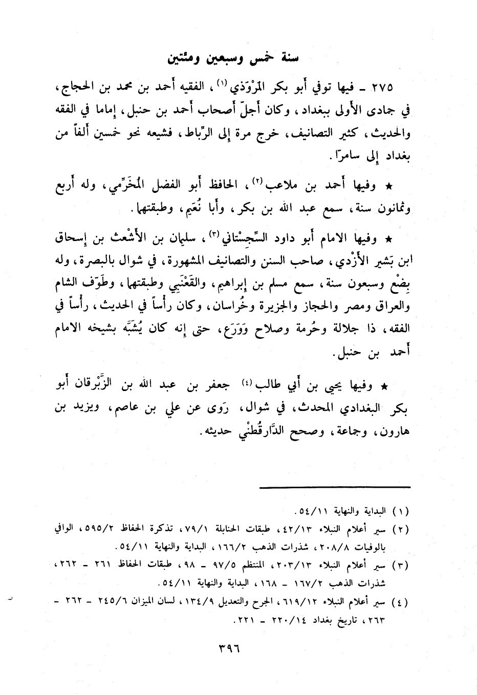 وفيها الإمام أبو داود السجستاني، سليمان بن الأشعث بن إسحاق ابن بشير الأزردي، صاحب السنن التصانيف المشهورة، في شوال بالبصرة، وله بضع وسبعون سنة، سمع مسلم بن إبراهيم، والقعنبي وطبقتهما. وطوف الشام والعراق ومصر والحجاز والجزيرة وخراسان، وكان رأساً في الحديث، رأساً في الفقه. ذا جلالة وحرمة وصلاح وورع، حتى إنه كان يشبه بشيخه الإمام أحمد بن حنبل.